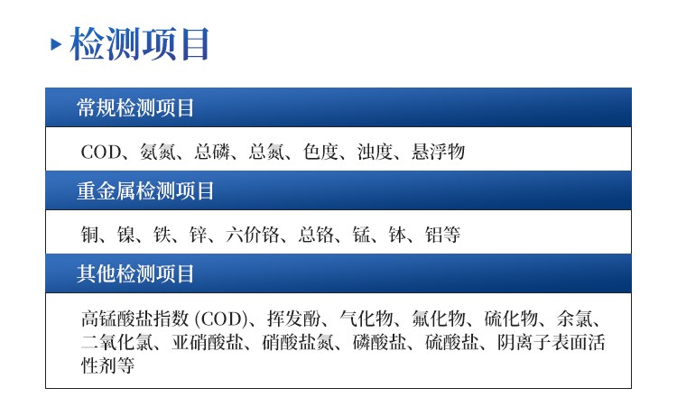 六价铬、总铬、镍、总镍、铜、总铜、锌、总锌、铁、总铁、锰、总锰、砷、总砷、总氯、镉、铅、钛、钒、银、铝、硼、锡、铍、钡、锑、汞、钴等几十余种。