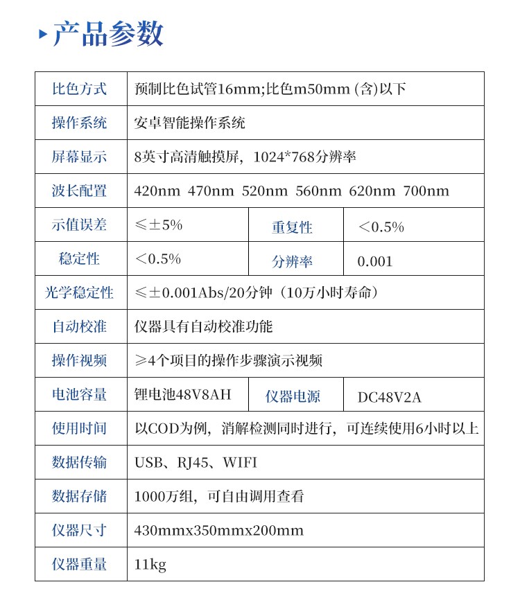 5、便携一体式检测设备,内置大容量锂电池,可一机实现户外水样消解、测定。
