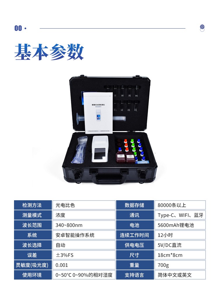 波长范围:340~800nm、系统:安卓智能操作、系统波长:选择自动、显示屏幕:3.5寸彩色液晶屏、误差:<0.5%、灵 敏 度(吸光度):0.001、使用环境:0~50℃,0~90%的相对湿度数据存储、通讯:Type-C、WIFI、蓝牙电池5600mAh锂电池连续工作时间12小时供电、电压:5V/DC直流、尺寸:18cm*8cm、重量:700g、支持语言:简体中文或英文。