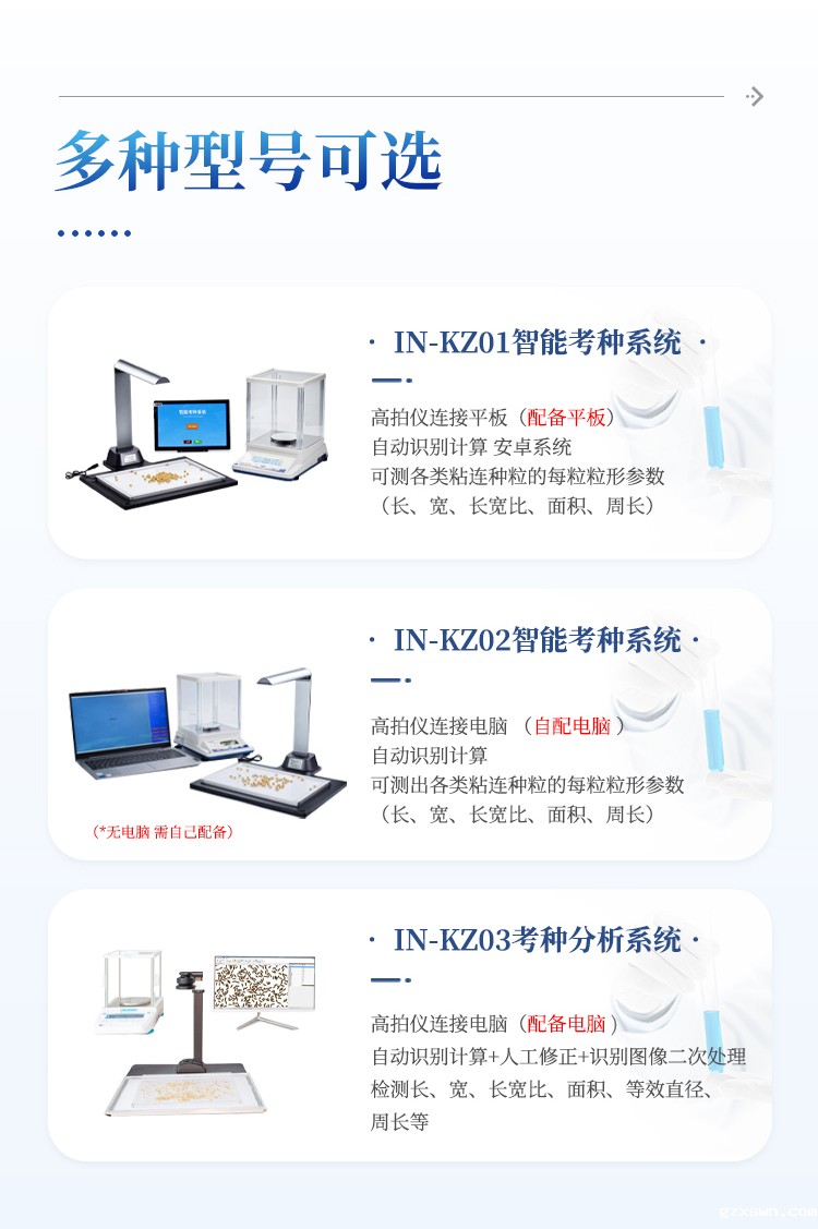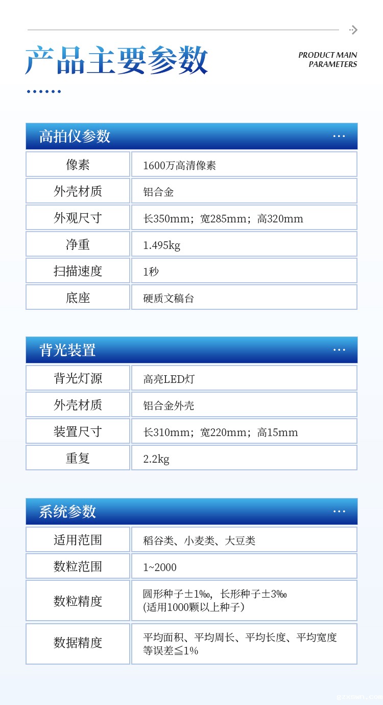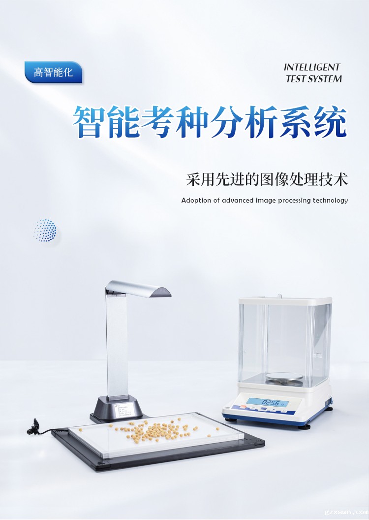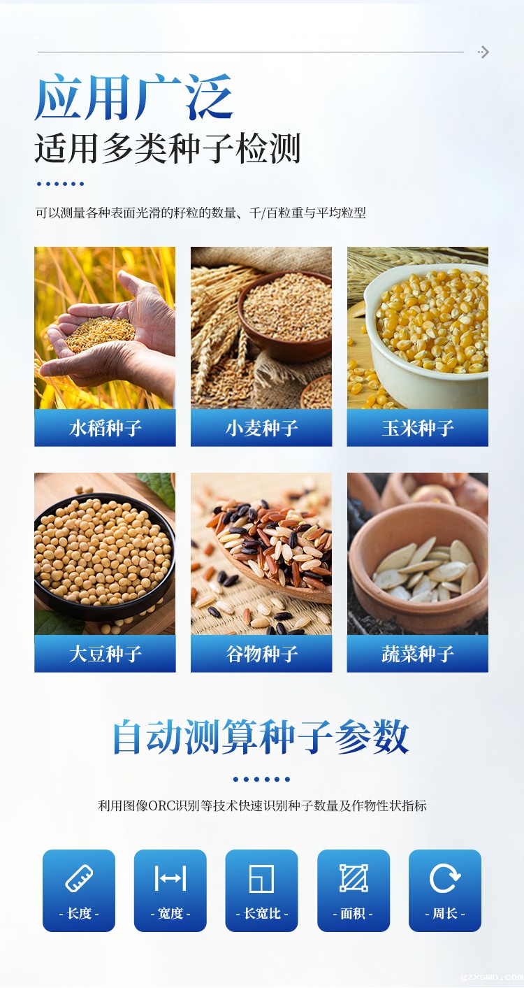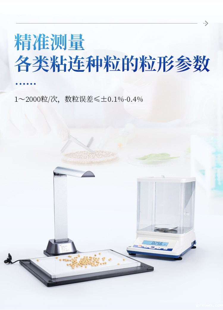 智能考种系统可以测量各种表面光滑的籽粒的数量、千/百粒重与平均粒型(包括长、宽、长宽比、周长、面积),利用图像ORC 识别技术、图像定位、空间转换等技术实现快速识别种子数量及作物性状指标。