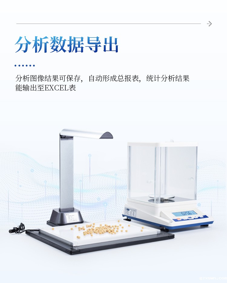 智能考种系统由1600万高拍仪和背光装置组成。背光装置采用的是高亮LED灯,外边框使用铝合金材质制成。软件采用先进的图像处理技术,根据距离变换原理、形态学、凸包检测等技术综合设计的一款嵌入式软件。该设备主要应用在农业领域的田间作物测产及考种等方面,通过高拍仪拍摄的照片,软件自动计算种子数量,种子的面积、周长、长度、宽度、长宽比等数据,根据天平所得的重量与种子的数量自动计算出千粒重;以列表和图形的方式输出结果,便于用户查看与分析研究。本产品也可以手动对作物种子数量修正以确保计数精度、对数据进行保存,并且可以查看数据报表,最后可以将数据以Excel格式导出。