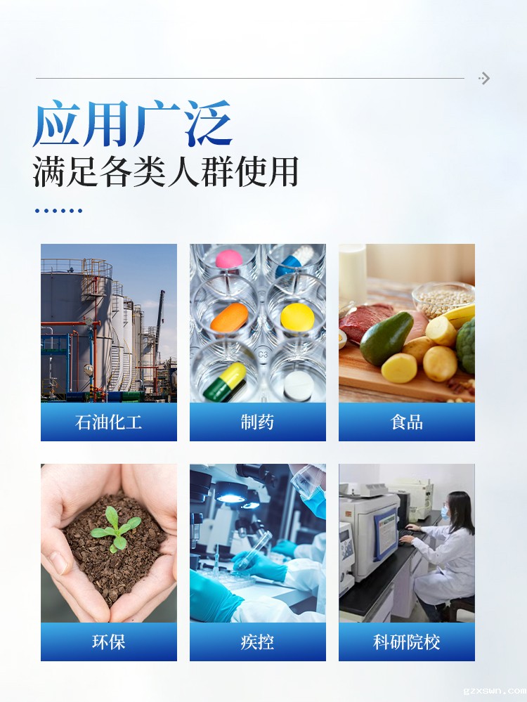 产品应用于环境、疾控、食品、质量监督、矿山能源、石油精精炼、化工、卫生、电力、白酒等以及各大学高校和科研院所等。