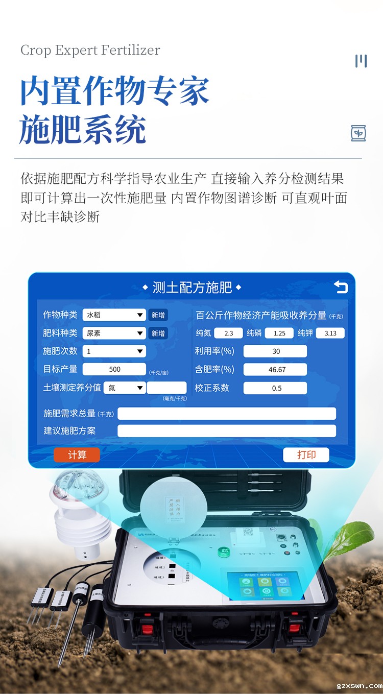 17.内置测土配方施肥系统,检测完成后可直接进行测土配方施肥计算;同时具有单独配方施肥计算模块;仪器内置百余种常见经济作物标准养分值,内置施肥校正系数,可对目标产量计算施肥量,以此指导农业生产;测土配方施肥结果可打印,打印内容包含作物种类、肥料种类、目标产量、需求总量、建议施肥方案。