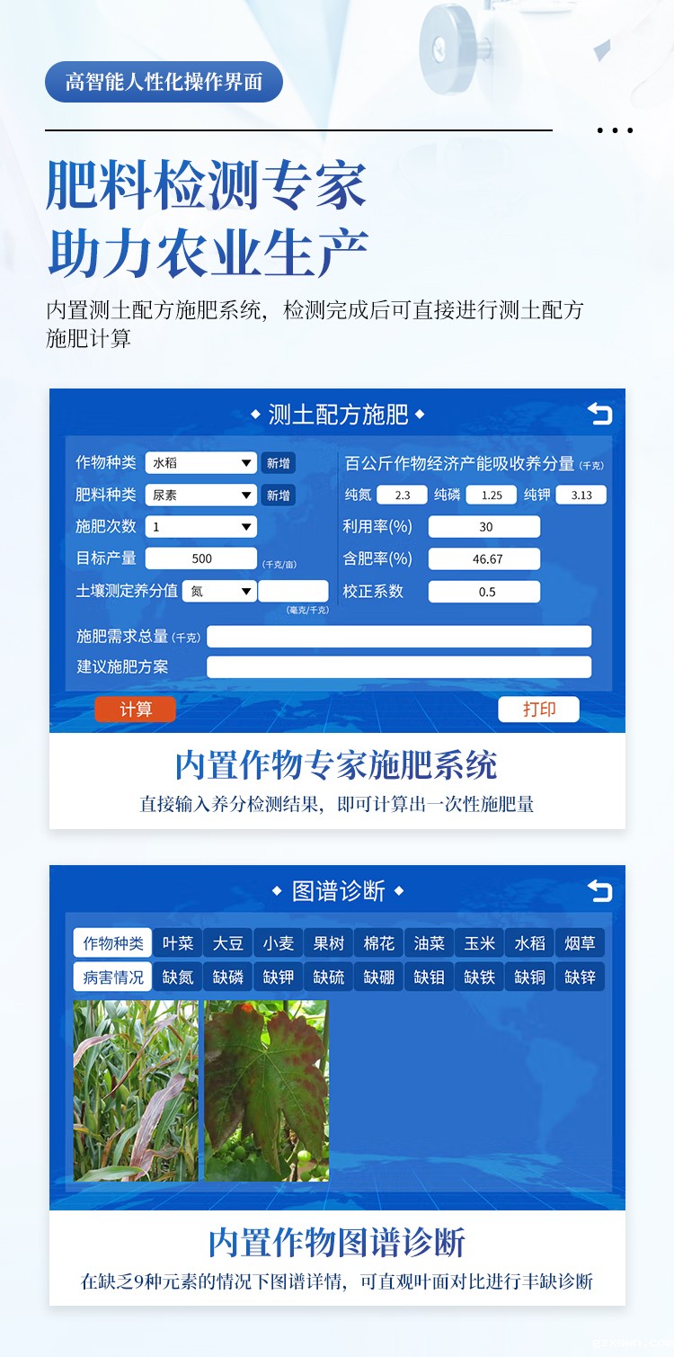 测肥料氮、磷、钾三项需50分钟左右,微量元素单项检测需20分钟左右。