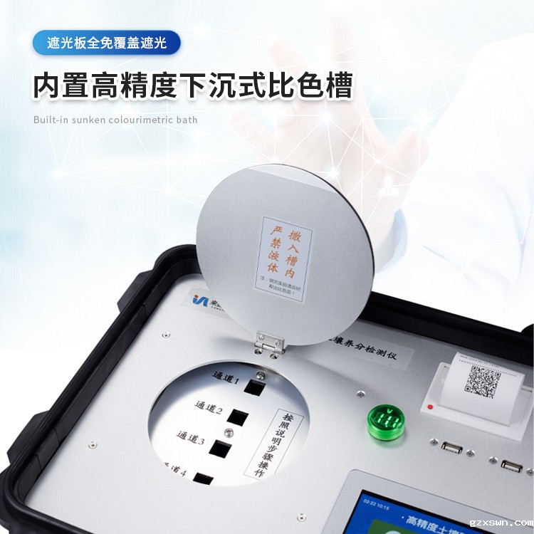 18.比色槽内置于下沉式密闭舱内,直径为15.7cm圆形遮光板全面覆盖遮光,避免实验过程中出现漏光影响检测精度,保证检测结果准确。