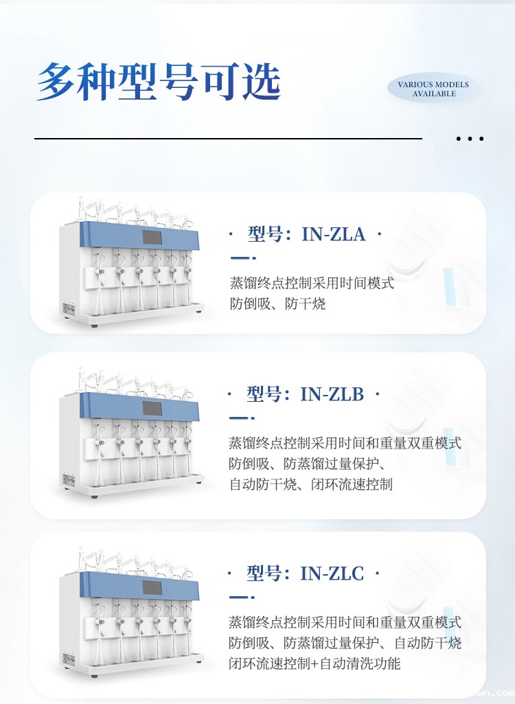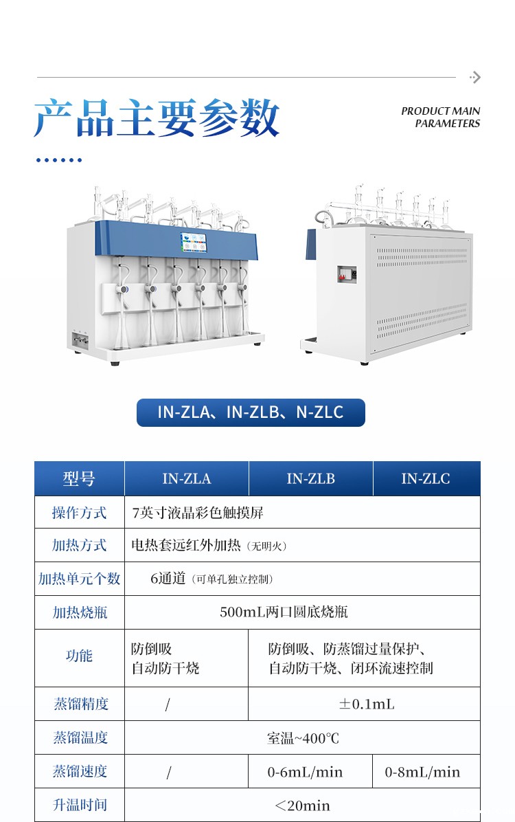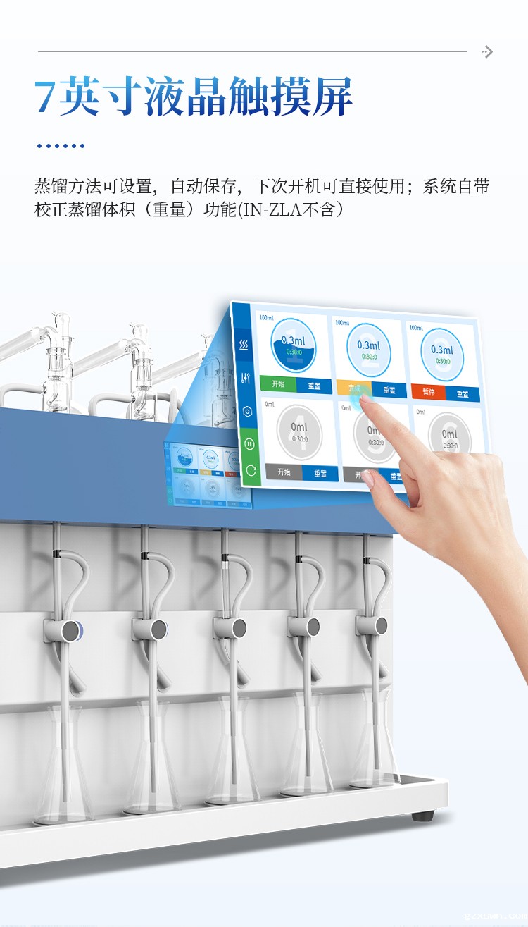 简要描述: IN-ZLA智能一体化蒸馏仪是根据实验室蒸馏预处理操作规程设计,集恒温加热、蒸馏终点自动控制、冷却水循环于一体的新型智能蒸馏处理装置,该仪器具有精密温控、自动化防倒吸、防爆沸等功能,解决了传统蒸馏装置操作繁杂不便、资源浪费等问题。