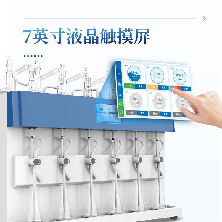 2、采用7寸液晶触摸屏控制,蒸馏方法可设置,自动保存,下次开机可直接使用;系统自带校正蒸馏体积(重量)功能。