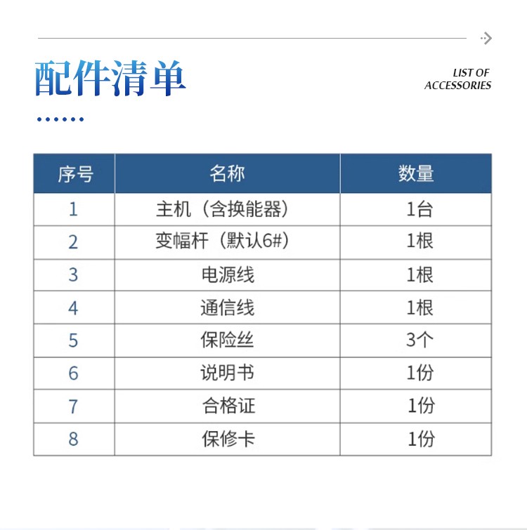 8. 具有变幅杆自动匹配、频率自动跟踪、故障自动报警(或保护)等功能;