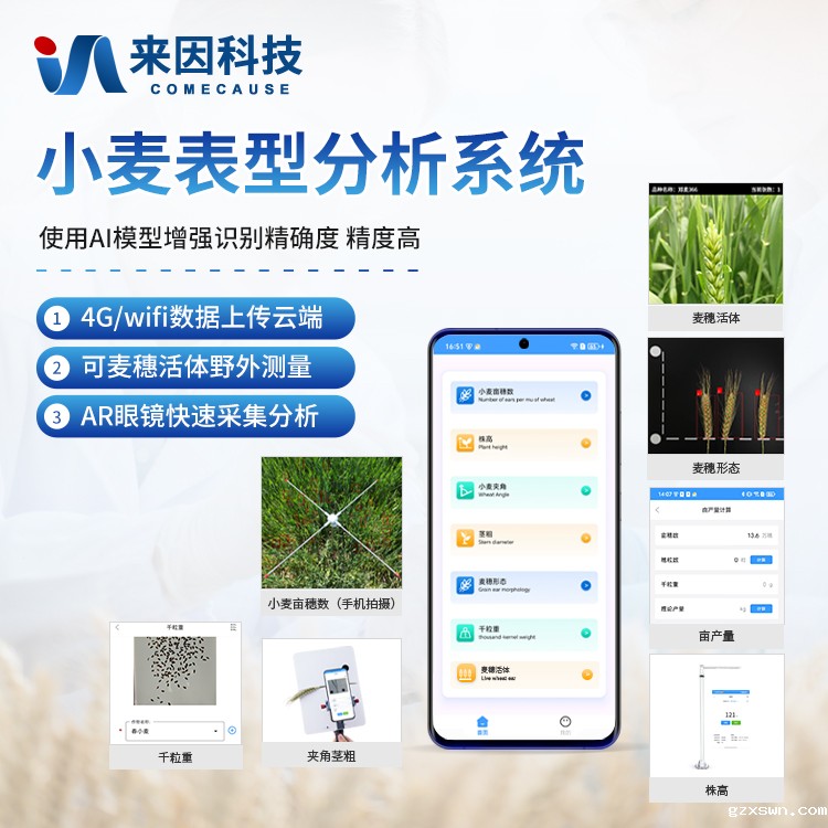 4)麦穗形态测定仪依托手机视觉技术,通过AI图像矫正算法一键获取穗长、小穗数等关键指标。全系统实现田间快速取样、批量分析及数据互联,为育种优化、产量预测和功能基因解析提供智能化解决方案。