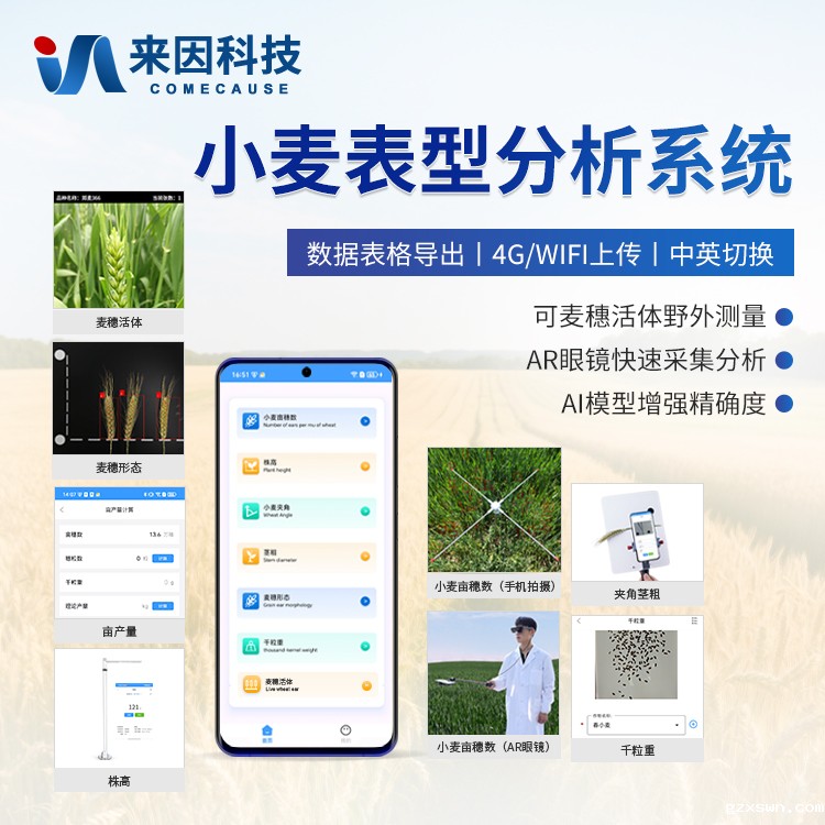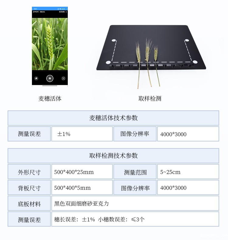 4)麦穗形态测定仪依托手机视觉技术,通过AI图像矫正算法一键获取穗长、小穗数等关键指标。全系统实现田间快速取样、批量分析及数据互联,为育种优化、产量预测和功能基因解析提供智能化解决方案。