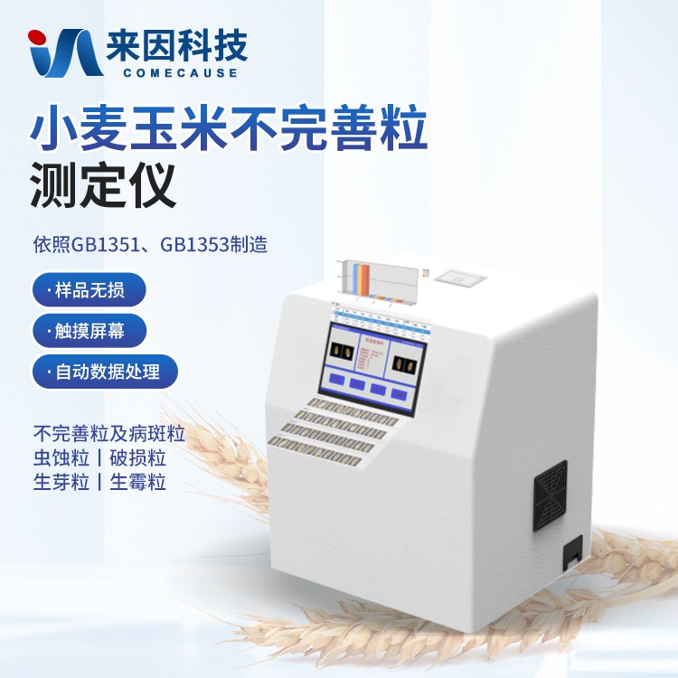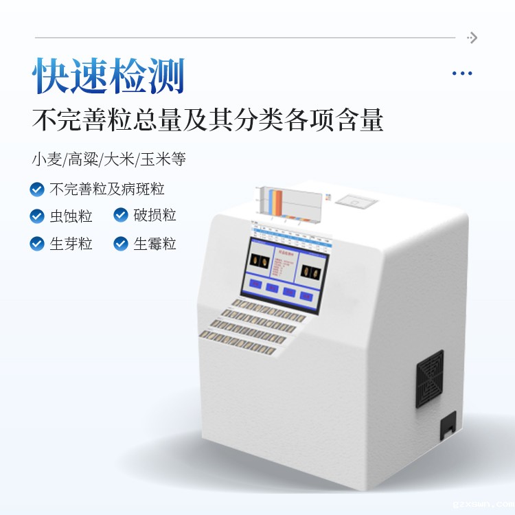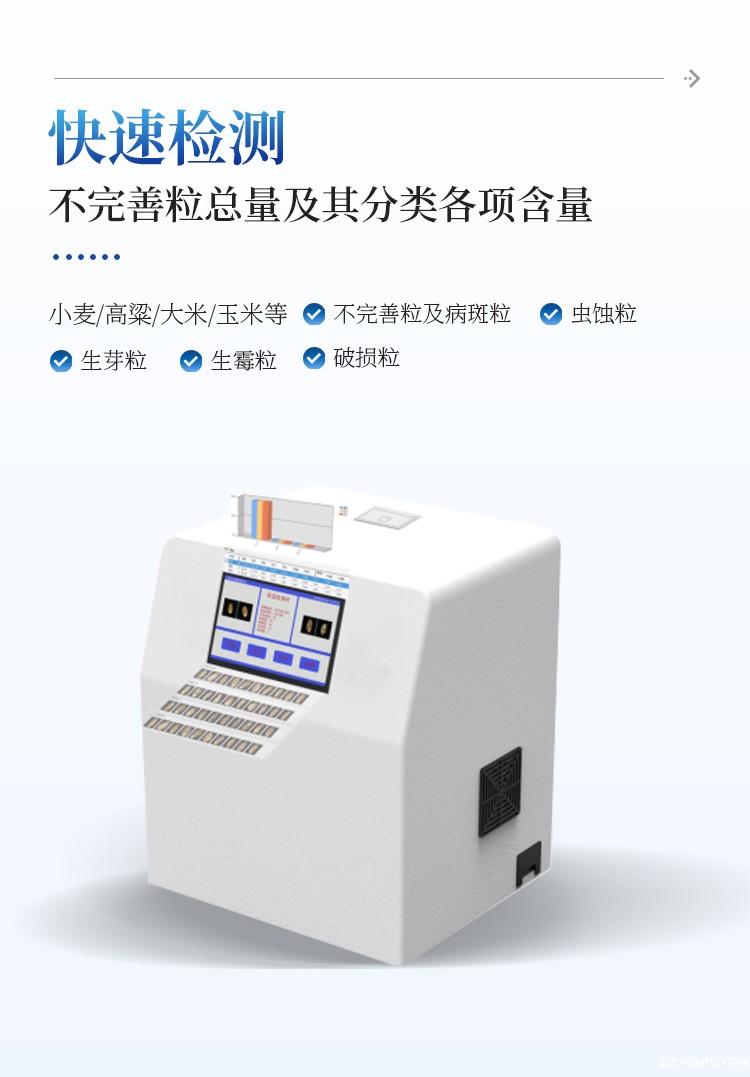 简要描述: 小麦玉米不完善粒测定仪是以小麦/高粱/大米等作物不完善粒作为测定对象,在自动获取粮食图像后,通过模式识别或深度学习等技术构建神经网络模型,实时分析粮食特征并计算出不完善粒百分比的专用仪器;振动送料,高清图像采集,保留样品的原始状态,对样品无破坏;检测结果:以质量百分比为结果输出方式,检测结果包含不完善粒总量及其分项含量。