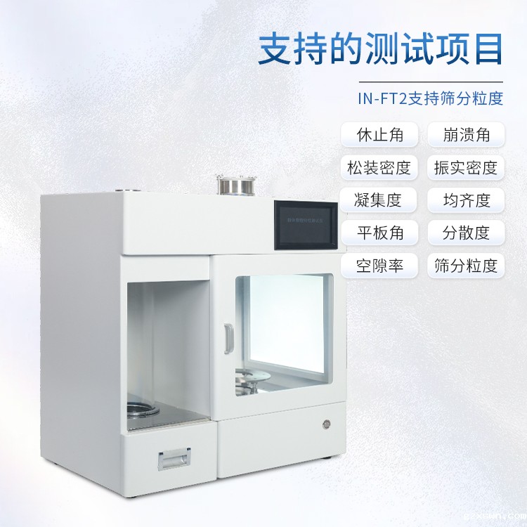 简要描述: 多功能粉体物理特性测试仪IN-FT2输入输出子系统:7寸触摸屏;角度测量:图像法,自动测量;振实密度:振实频率: 0 —— 300 转/分钟,可调 振动幅度: 3mm, 14mm(可选);振动筛规格(孔径):45μm,75μm,150μm,250μm,355μm,425μm,1000μm,1400μm,2000μm。