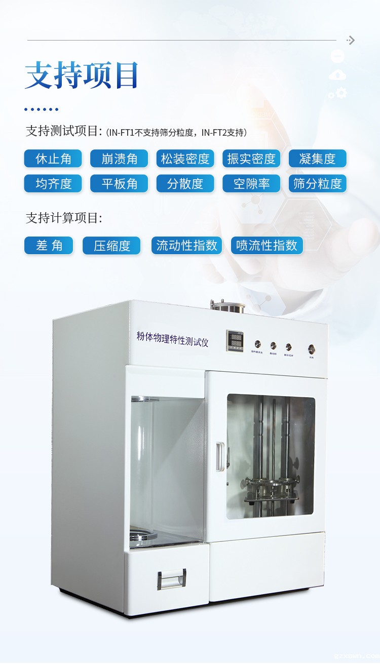 简要描述: 粉体综合特性测试仪IN-FT1角度测量:量角器,手动测量;振实密度:振实频率: 300 转/分钟,固定振动幅度: 3mm, 14mm(可选);重复性误差:≤3%;尺寸:680mm(L)380mm(W)750mm(H);供电:AC220V±10V 50Hz。