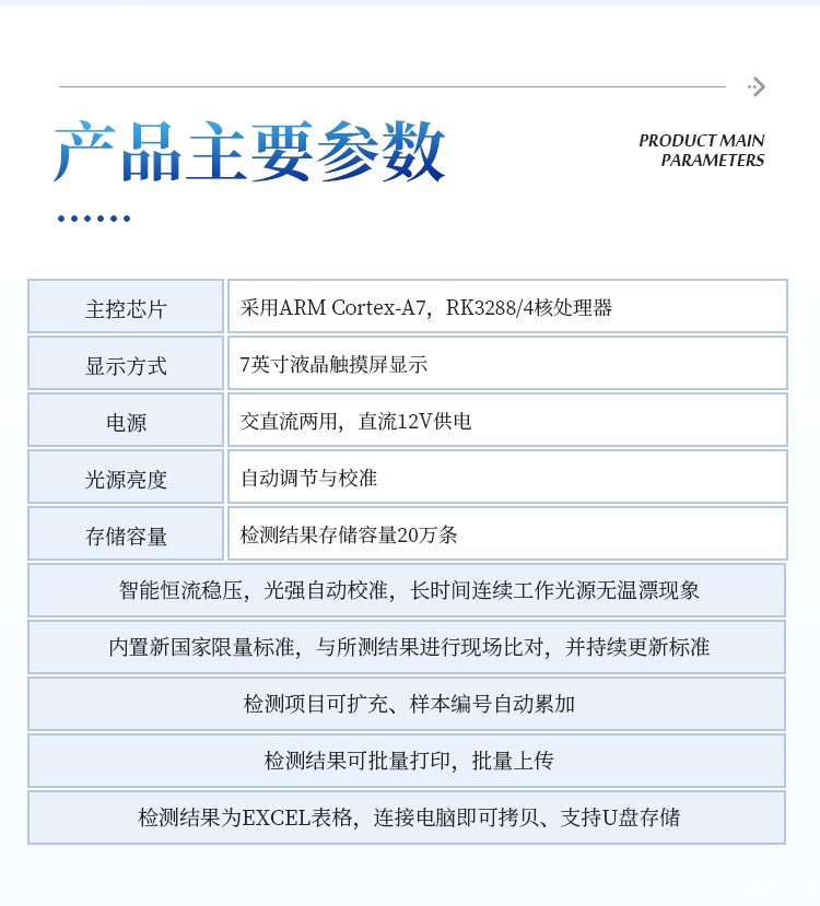 5、智能恒流稳压,光强自动校准,长时间连续工作光源无温漂现象。。