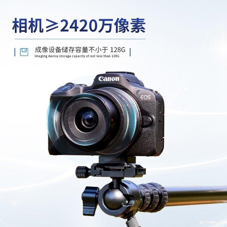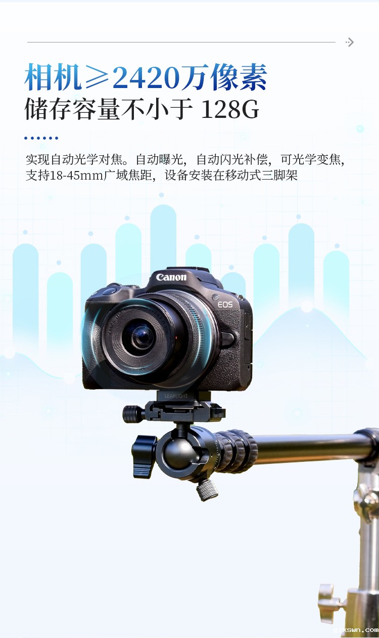 4.成像设备储存容量不小于 128G,像素≥2420万像素,可实现自动光学对焦。自动曝光,自动闪光补偿,可光学变焦,支持18-45mm广域焦距,设备安装在移动式三脚架。