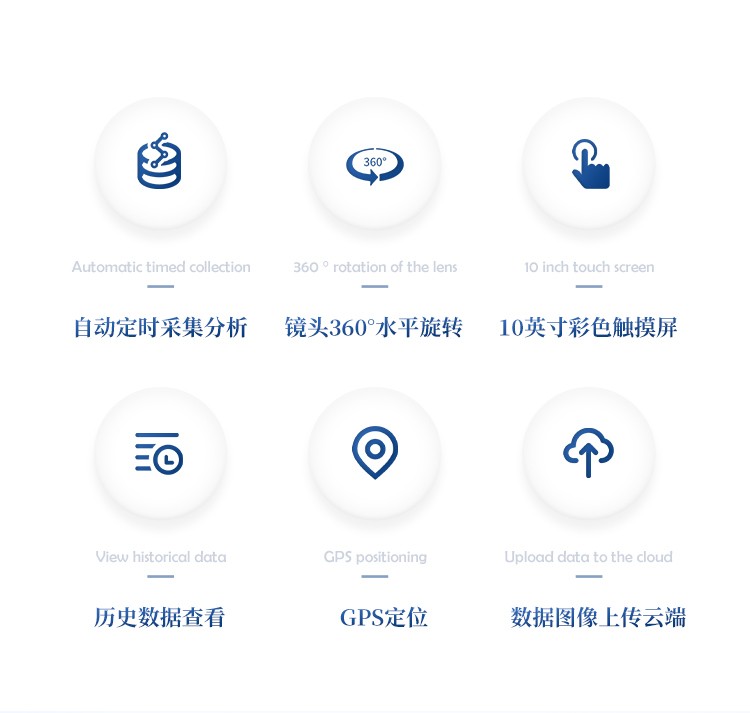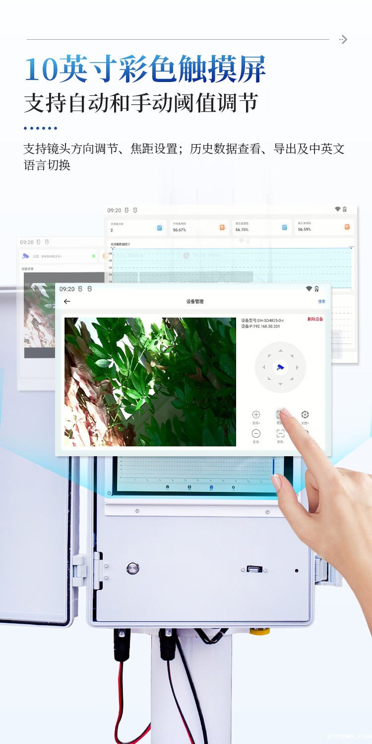4. 分析主机:10寸彩色触摸显示屏,支持自动和手动阈值调节;自动区分植被与非植被区域;支持镜头方向调节、焦距设置;支持历史数据查看、导出及中英文语言切换。