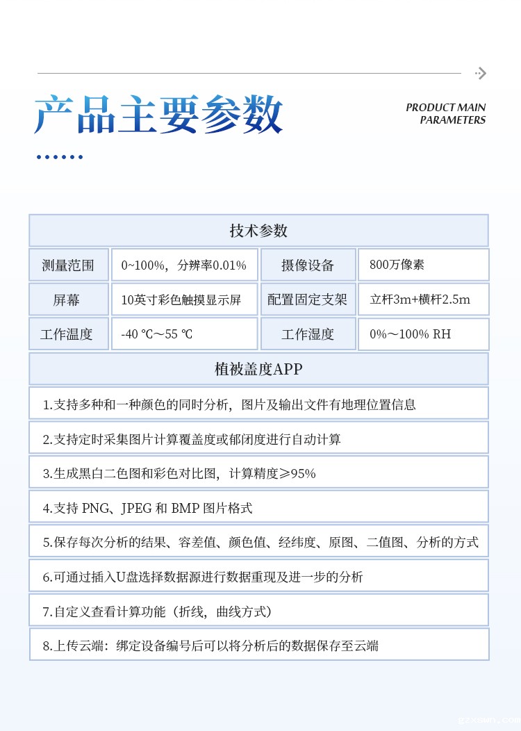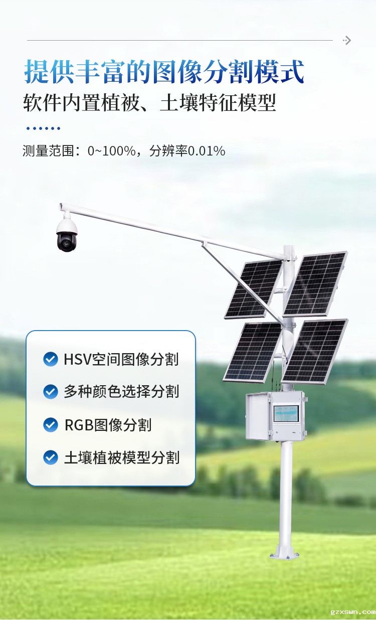 2. 测量范围:0——100%,分辨率0.01%;支持HSV空间图像分割、RGB图像分割,多种颜色选择分割,土壤植被模型分割。