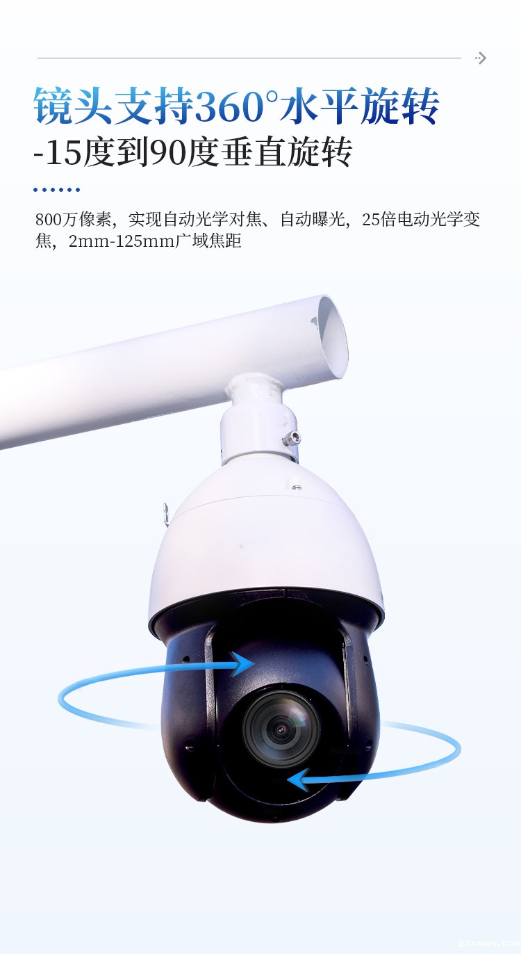 3. 摄像设备:800万像素,可实现自动光学对焦、自动曝光,25倍电动光学变焦, 2mm-125mm广域焦距;镜头支持360度水平旋转,-15度到90度垂直旋转