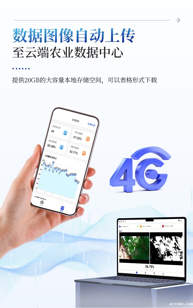6. 数据存储与传输:提供20GB的大容量本地存储空间,数据与图像支持USB导出及4G无线传输自动上传至云端农业数据中心,用户可通过专用账号访问并以表格形式下载