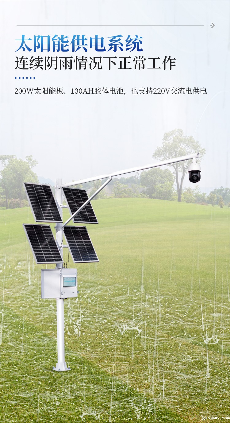 7. 配置太阳能供电系统(200W太阳能板、130Ah胶体电池),保证在连续阴雨的情况下正常工作,也可支持220V交流电供电