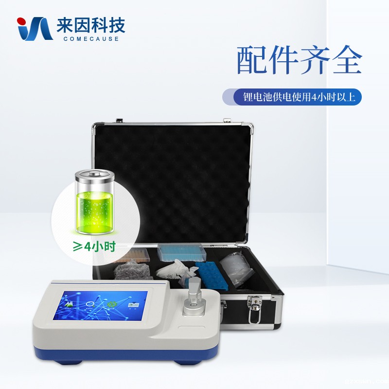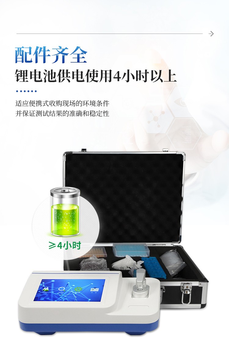 10、内置锂电池供电,交直流两用,可脱电使用4小时以上,适应便携式收购现场的环境条件并保证测试结果的准确和稳定性;