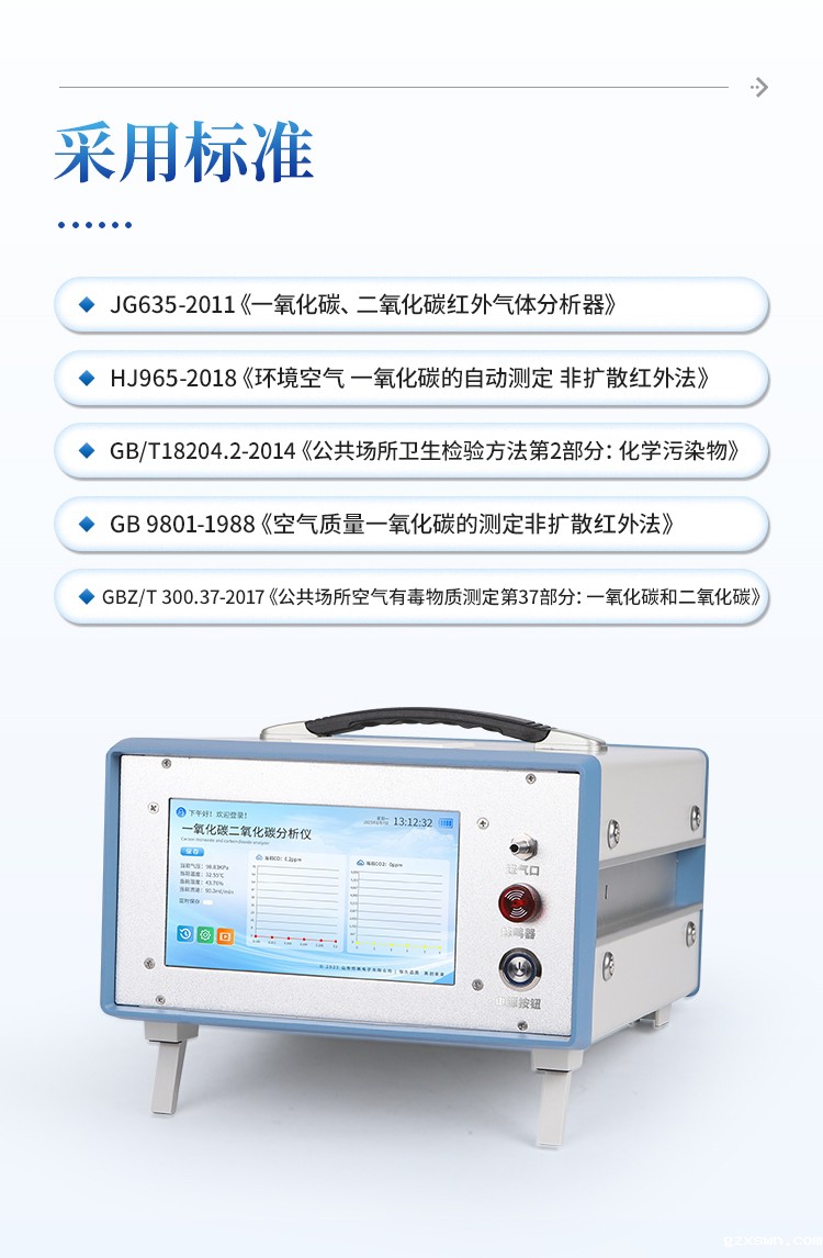 红外CO是我厂新推出的一种利用红外光谱吸收原理,对低浓度的一氧化碳测量仪器,红外一氧化碳检测仪,同时可以检测一氧化碳浓度、温度和湿度。具有非常清晰的彩色触摸屏,声光报警提示,带内置泵,红外一氧化碳气体分析仪广泛用于公共场所、卫生监督、环境监测、等气体的检测与监测。成功解决了,在高温和低温测量中的精度保证和补偿、精度非常的高,可用于科研等监测部门。本仪器符合GB/T18204.23-2000《公共场所空气中一氧化碳检验方法》和GB/T9801-88《空气质量一氧化碳的测定非分散红外法》的国家标准;符合JJG635-2011《一氧化碳、二氧化碳红外线气体分析器》的国家计量检定规程。