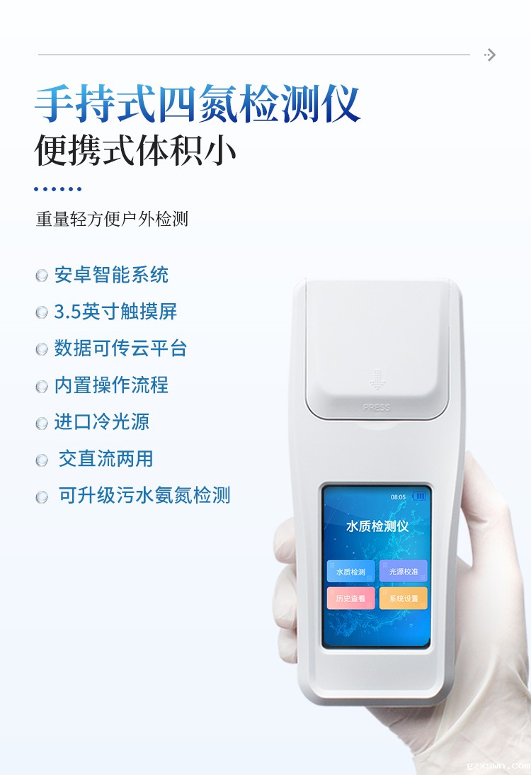 简要描述: 手持式硝酸盐氮检测仪主要检测水体中的硝酸盐氮含量;参考方法《变色酸光度法》研发设计制造,仪器配备高清晰度彩色液晶触摸显示屏,Android智能操作系统,中文显示界面,中英文键盘,人性化操作,使用更简单。
