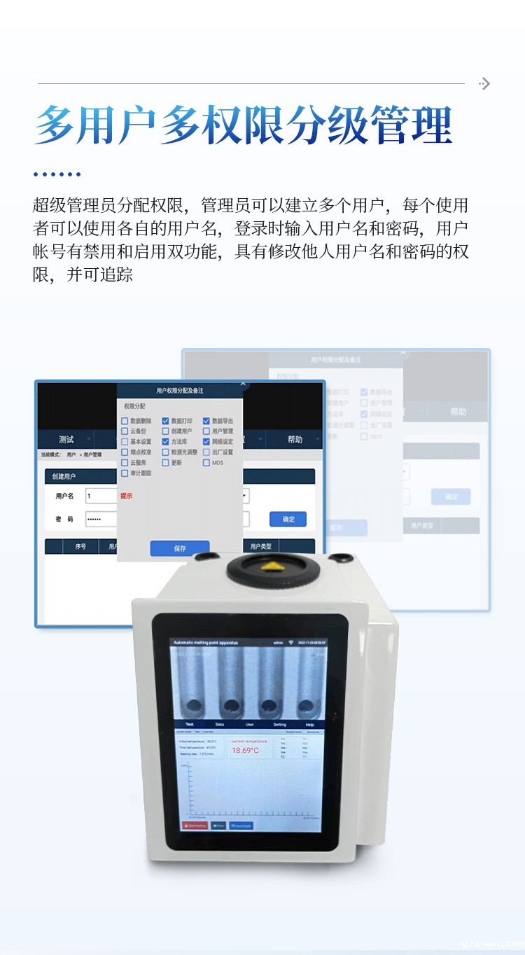 完整版审计追踪和用户分级权限管理, 超级管理员可以修改所有人密码和用户名并可追溯,超级管理员可以修改所有操作员权限,用户帐号有禁用和启用两个功能,人员更替暂时不用账户时可以锁定,使用时可以解封,U盘导出PDF和Excel数据防篡改功能。