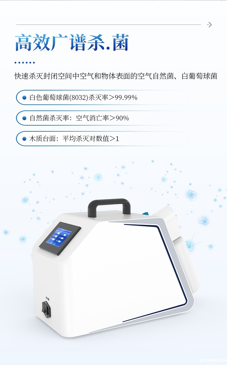 过氧化氢消毒机利用低浓度的过氧化氢消毒剂来实现消毒效果;主要用于室内环境和中央空调系统,可快速杀灭封闭空间中空气和物体表面的空气自然菌、白葡萄球菌。使用低浓度的过氧化氢,每立方米仅需几毫升的用量,且环境湿度仅上升少许。在消毒过程中,无需加热、中和等过程,方便快捷。广泛应用于医院、疾控中心、实验室、生物制品等领域。