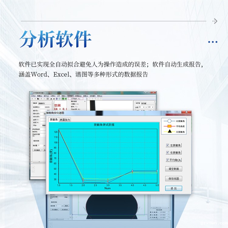 10. 动态拍摄、视频快速测试数据,可以连续性记录测试接触角的变化,再由软件自动批量拟合;