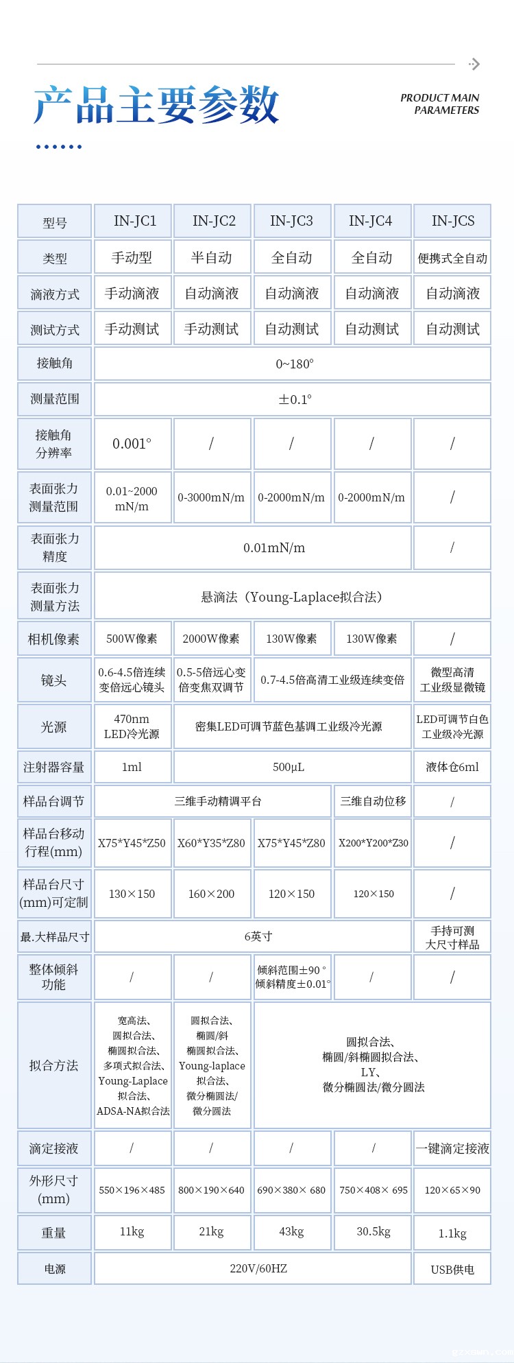 分析软件功能 | 1、国内最先进的接触角测量分析软件自动拟合法(一键自动拟合, 不存在人工误差)包括:圆法拟合(Circle method)、椭圆/斜 椭圆拟合法(Ellipse/Oblique ellipse)、LY、微分椭圆法/微 分圆法(Differential circle / Differential ellipse);2、动态接触角拟合(批量拟合多张图像)包括:润湿性能测试 (Wettability)、视频连续拟合计算(Video analysis);3、 表面能计算(Surface energy);4、 表面张力测量(Surface tension);5、 粘附功(Adhesion work); |