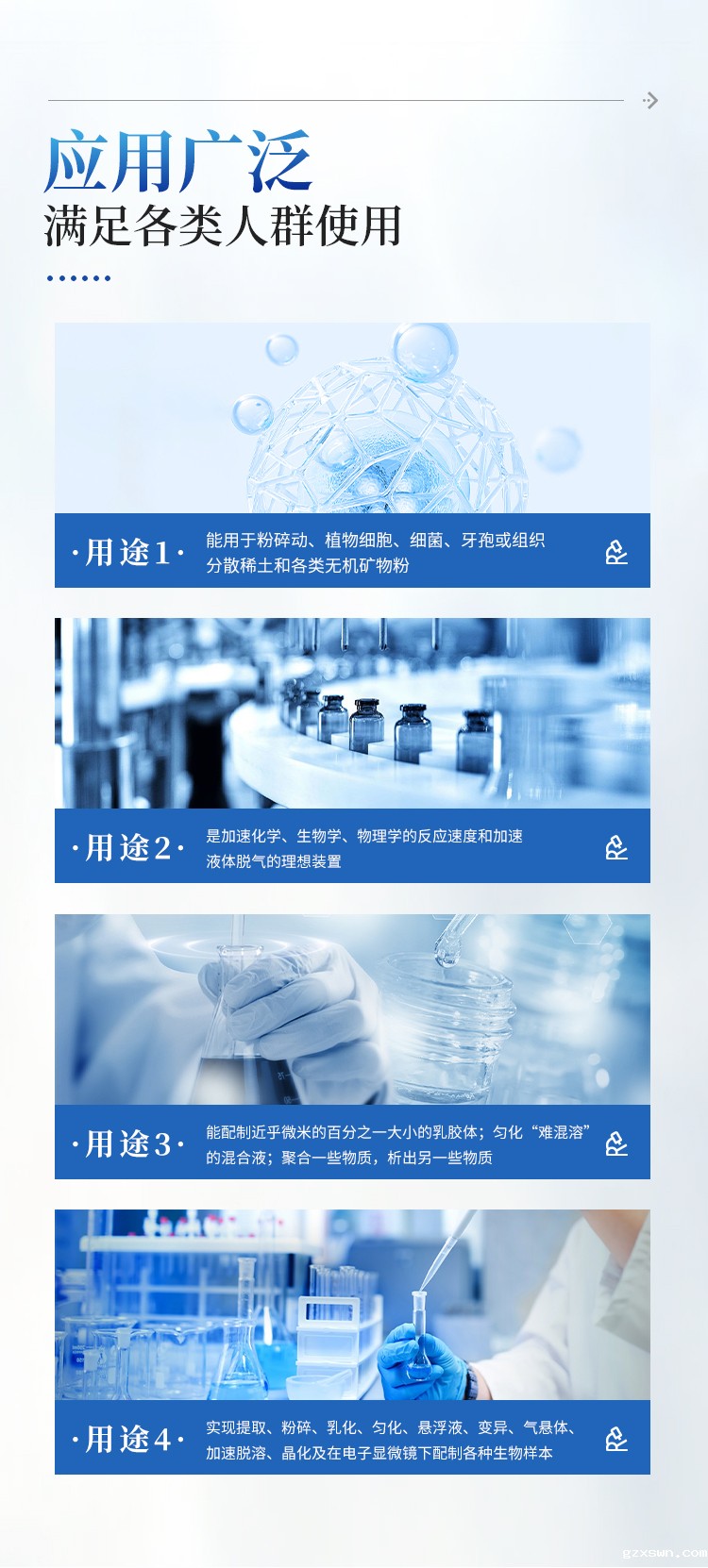 超声波破碎仪能用于粉碎动、植物细胞、细菌、牙孢或组织。分散稀土和各类无机矿物粉。