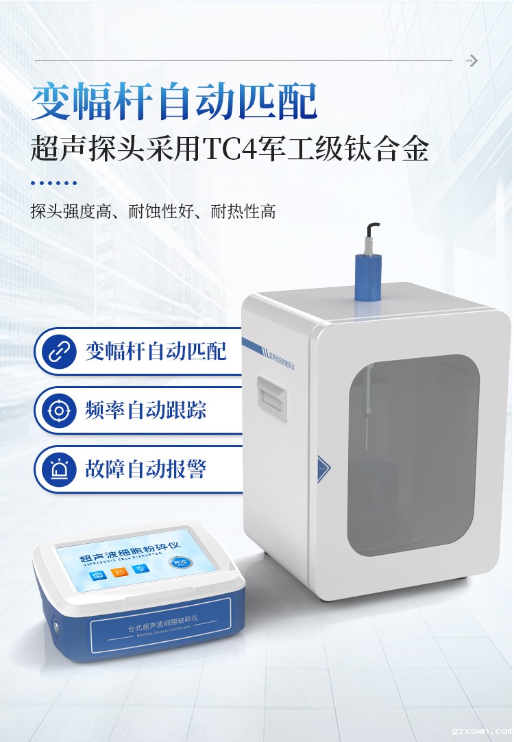 利用超声波在液体中的分散效应,使液体产生空化的作用,从而使液体中的固体颗粒或细胞组织破碎.超声波细胞粉碎机由超声波发生器和换能器二大部分组成。超声波发生器将市电转变成20-25KHz交变电能供给换能器。锆钛酸钡压电振子是换能器的心脏,它随交变电压以20-25KHz频率作伸缩弹性形变,换能器随之作纵向机械振动。振动波通过浸入在生物溶液中的钛合金变幅杆产生空化效应,激发介质里的生物微粒剧烈振动。