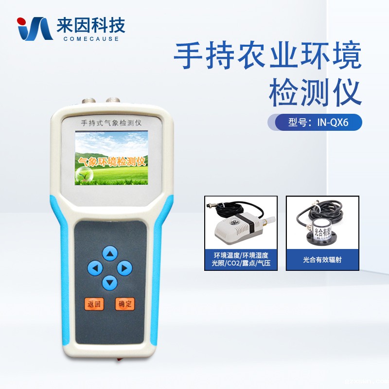 简要描述: 手持式智能农业气象环境检测仪IN-QX6是我们专门针对农田、草场局部小尺度环境设计的,对与植被和农作物生长密切相关的土壤、水气等环境参数监测的农田小气候站。它主要观测与农业相关的空气温度、空气湿度、光照强度、二氧化碳浓度、露点温度、光合有效辐射等5个环境参数气象要素,为农业科研、农业生产等提供良好的支持。
