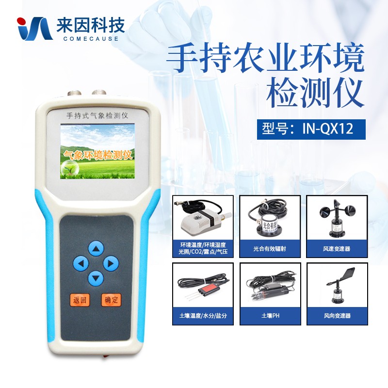 简要描述: 便携式气象站IN-QX12是我们专门针对农田、草场局部小尺度环境设计的,对与植被和农作物生长密切相关的土壤、水气等环境参数监测的农田小气候站。它主要观测与农业相关的空气温度、空气湿度、光照强度、二氧化碳浓度、露点温度、光合有效辐射、土壤温度、土壤水分、土壤盐分、土壤PH、风速、风向等12个环境参数气象要素,为农业科研、农业生产等提供良好的支持。