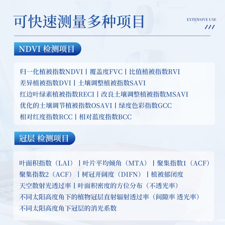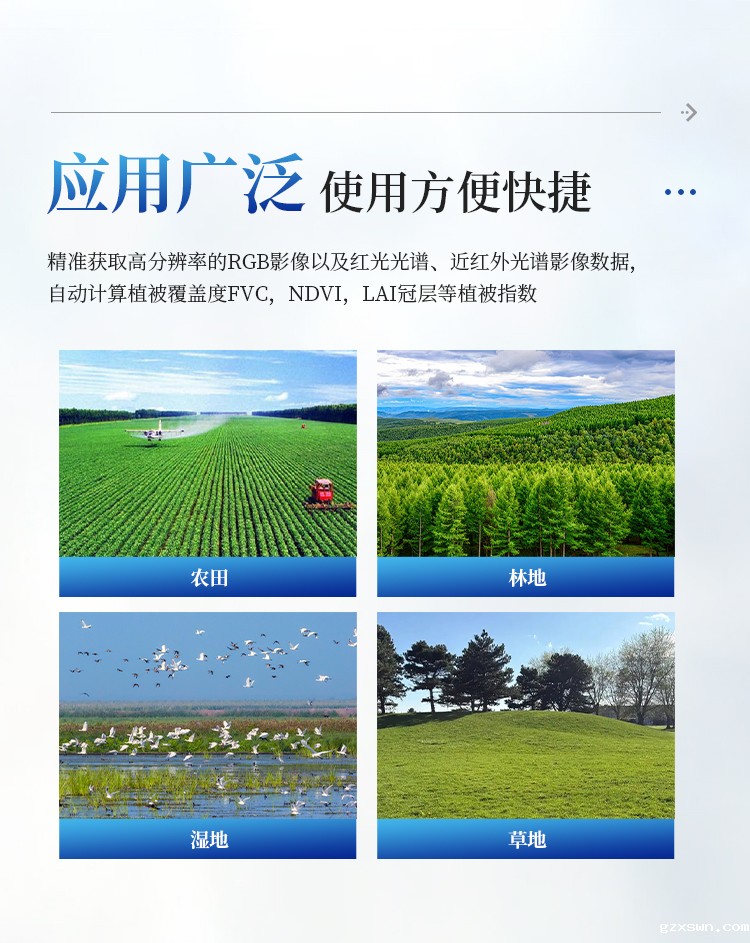 该仪器主要用于草地、农田、湿地、林地等野外数据采样调查,使用方便快捷,精准获取高分辨率的RGB影像以及红光光谱、近红外光谱影像数据,自动计算植被覆盖度FVC,NDVI,LAI冠层等植被指数