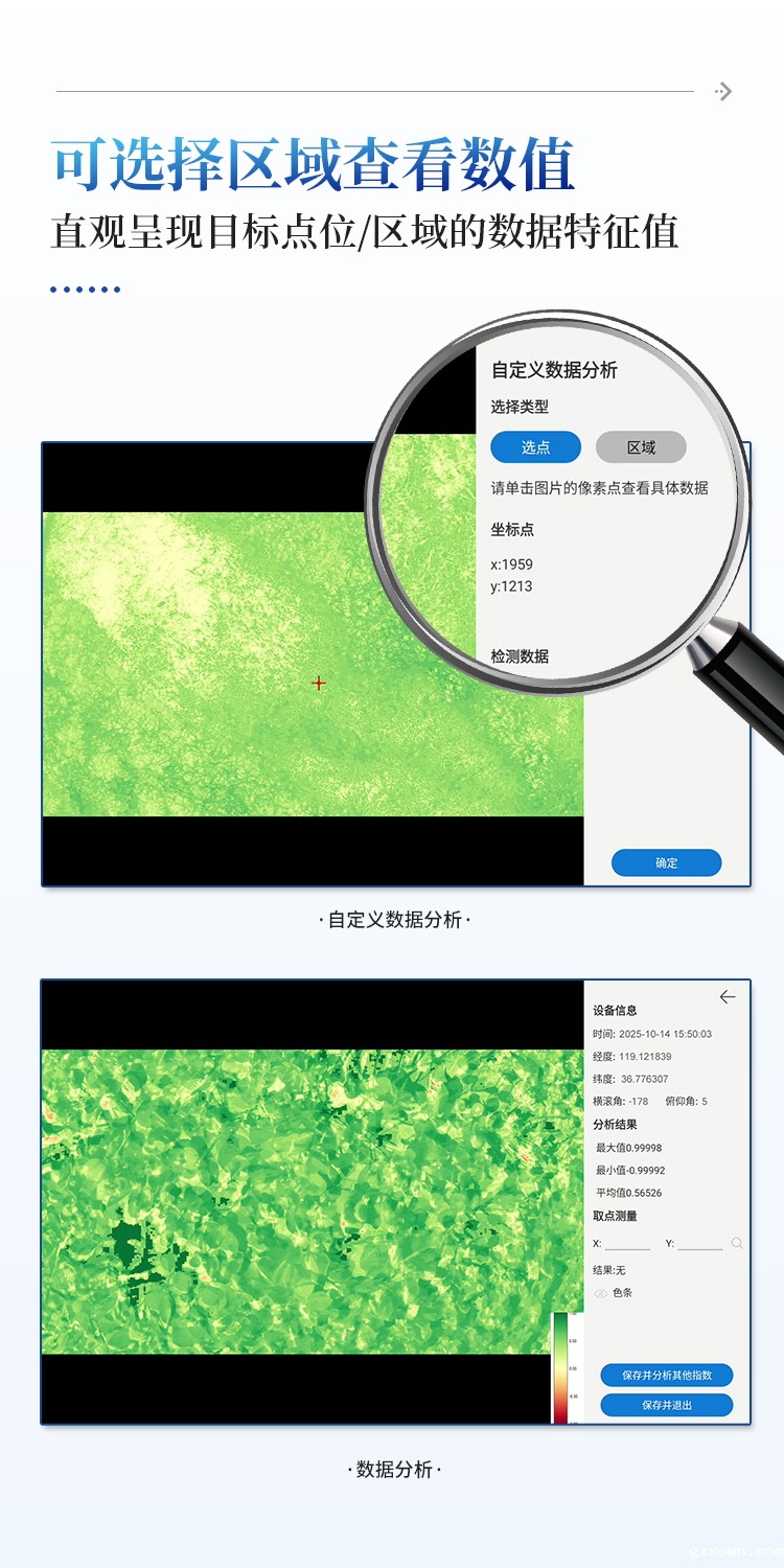 简要描述: 多光谱NDVI检测仪器主要用于草地、农田、湿地、林地等野外数据采样调查,使用方便快捷,精准获取高分辨率的RGB影像以及红光光谱、近红外光谱影像数据,自动计算植被覆盖度FVC,NDVI,LAI冠层等植被指数;可实时反馈图像传感器的俯仰角、翻滚角和方位角,当前经纬度。