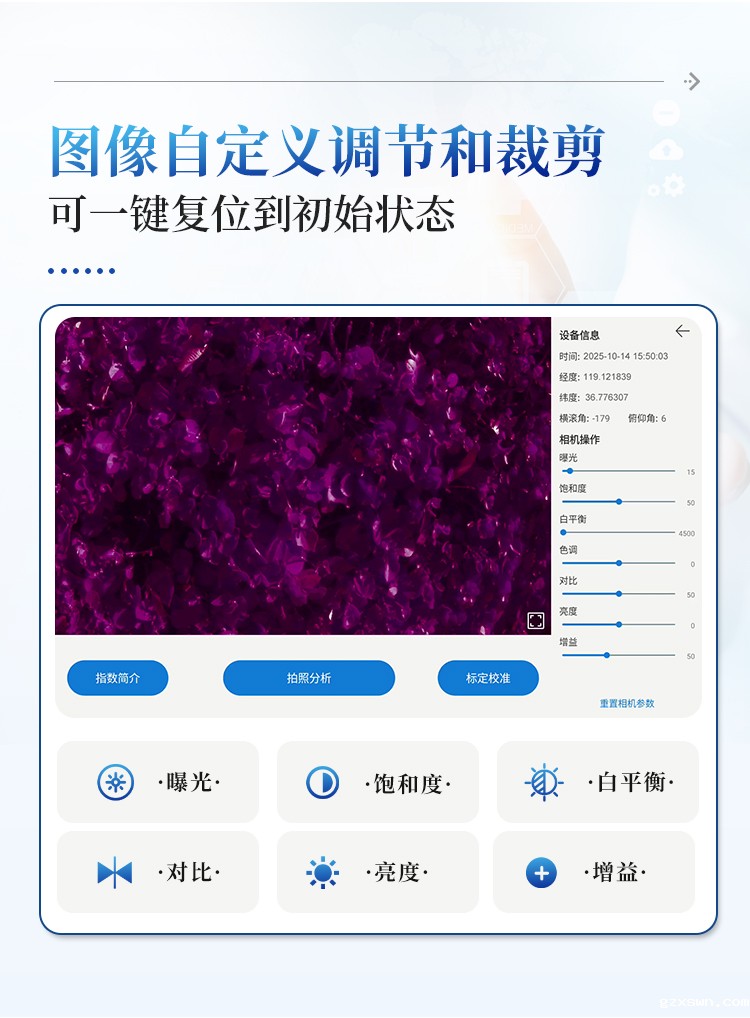 5. 图像调节: 支持曝光,饱和度、白平衡、色调、对比、亮度、增益等调节,支持图像自定义裁剪。可一键复位