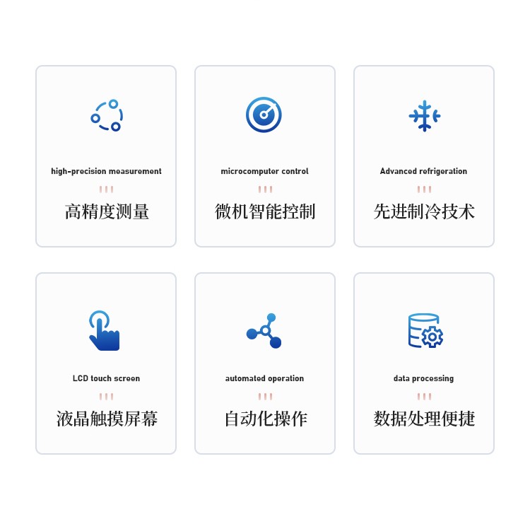 先进的电子制冷工艺,完全不受环境温度变化的影响,确保仪器内外筒温差符合国标要求。可连续长时间工作。采用美国先进技术的7.5英寸触摸式液晶屏幕.