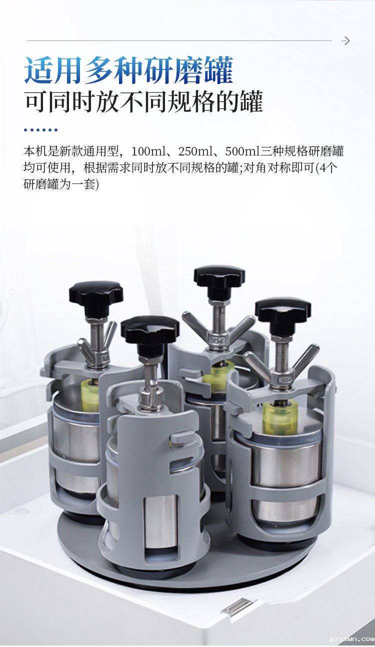 适用研磨罐:本机是新款通用型,100ml、250ml、500ml三种规格研磨罐均可使用,可根据客户需求同时放不同规格的罐;对角对称即可(4个研磨罐为一套)。