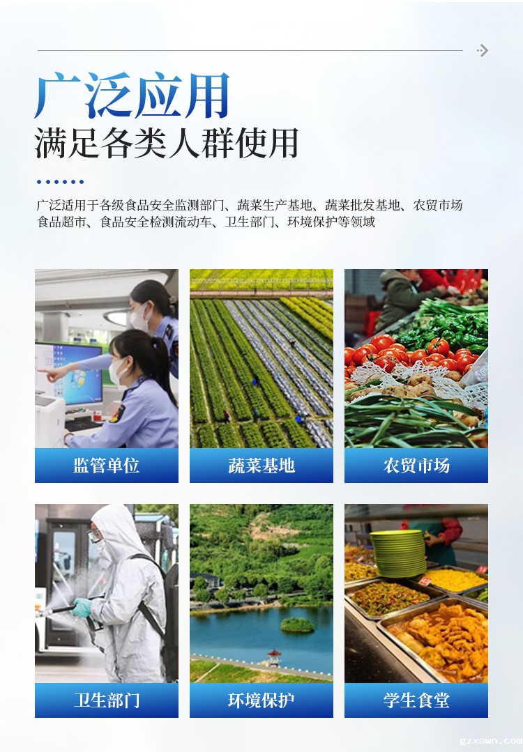 该仪器依据国家标准(GB/T 5009.199-2003)和农业标准方法(NY/T 448-2001)中的酶抑制率法设计制造,能准确、快速检测出蔬菜、水果、农产品、茶叶等固体或液体中有机磷和氨基甲酸酯类农药残留量。广泛适用于各级食品安全监测部门、蔬菜生产基地、蔬菜批发基地、农贸市场、食品超市、食品安全检测流动车、卫生防疫、环境保护等领域。