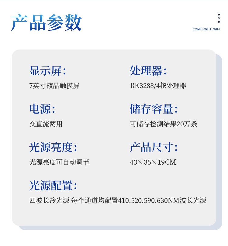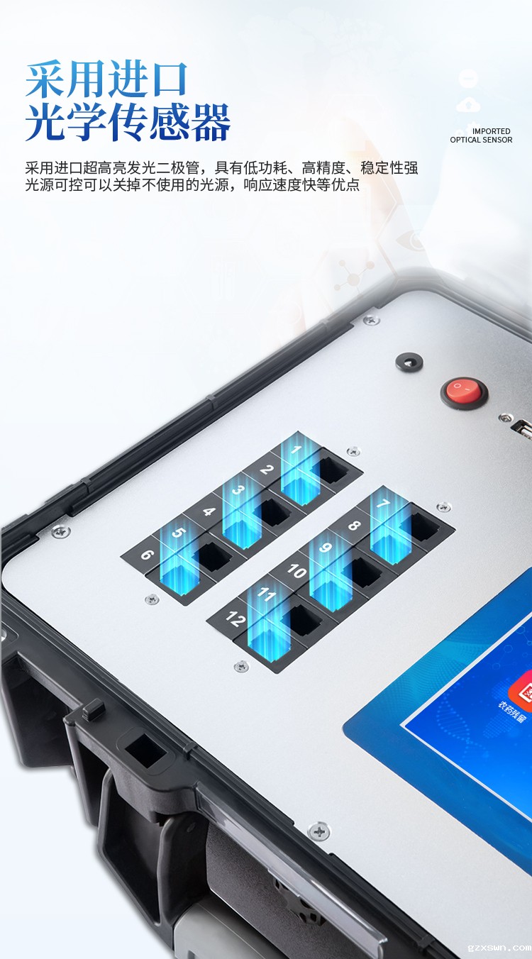4、四波长冷光源,12个检测通道,每个通道均配置410、520、590、630nm波长光源,标配先进的光路切换装置,专业光路切换功能可实现最多64波长,并且所有检测项目可实现所有通道同时检测。