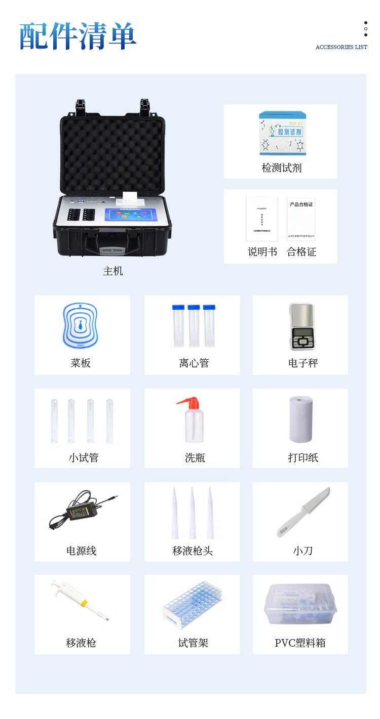 多功能食品安全检测仪可快速检测200多项目,包含非食用化学物质、滥用食品添加剂、农药残留、兽药残留、重金属、病害肉、营养强化剂、抗生素类残留、激素类残留、真菌毒素类残留、化学类残留等现场的定性定量检测。