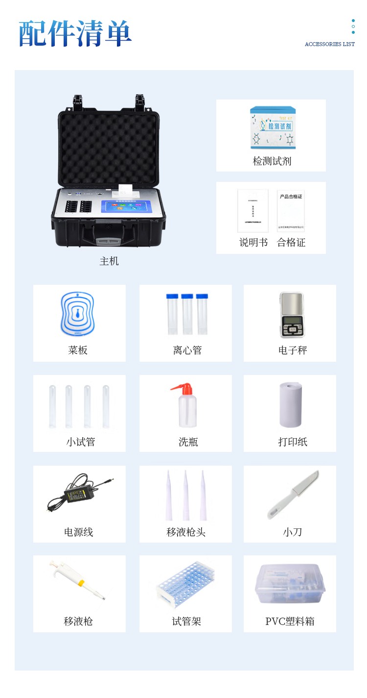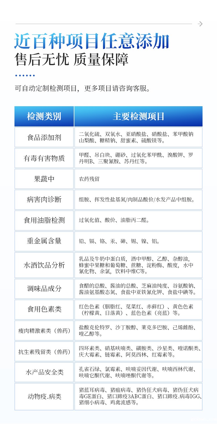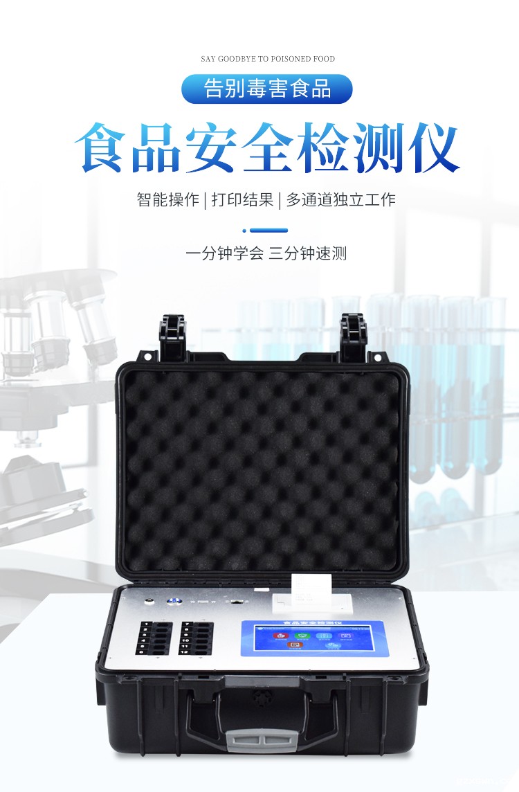 多功能食品安全检测仪可快速检测200多项目,包含非食用化学物质、滥用食品添加剂、农药残留、兽药残留、重金属、病害肉、营养强化剂、抗生素类残留、激素类残留、真菌毒素类残留、化学类残留等现场的定性定量检测。