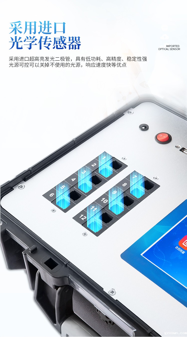 4、★四波长冷光源,24个检测通道,每个通道均配置410、520、590、630nm波长光源,标配先进的光路切换装置,专业光路切换功能可实现最多64波长,并且所有检测项目可实现所有通道同时检测。