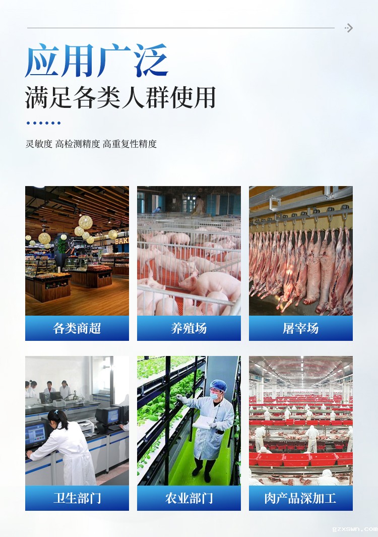 该多功能肉类检测仪为集成化肉品安全快速检测分析设备,广泛应用于各类商超、批发市场、养殖场、屠宰场、食品肉产品深加工企业、检验检疫部门、食药监局、卫生部门、高教院校、科研院所、农业部门等单位使用。