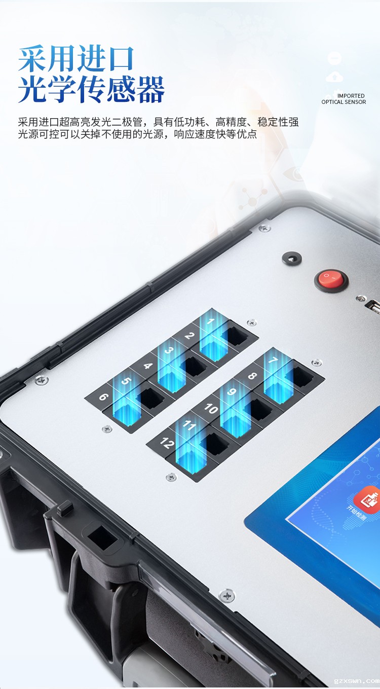 4、四波长冷光源,12个检测通道,每个通道均配置410、520、590、630nm波长光源,标配先进的光路切换装置,专业光路切换功能可实现最多64波长,并且所有检测项目可实现所有通道同时检测。