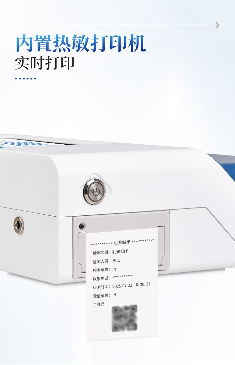 16、检测结果:报告出检测项目、被测物质的结果、检测单位、被检查单位、检验员、检测时间、检测限等信息可在触摸屏上显示,可通过仪器内置打印机输出
