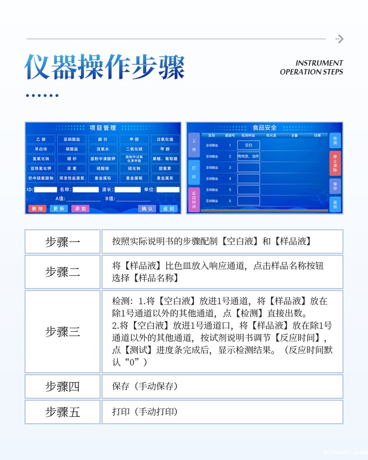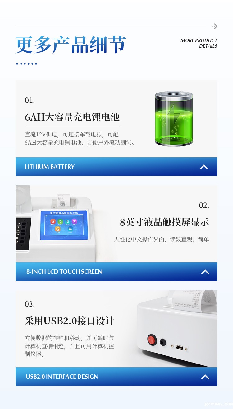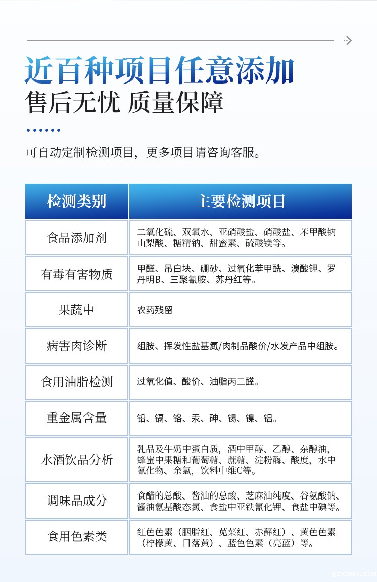 可快速检测各类食品中的甲醛、二氧化硫、亚硝酸盐的含量,仪器预留其他项目检测程序和端口,根据日后需求可方便的自主增加检测项目。