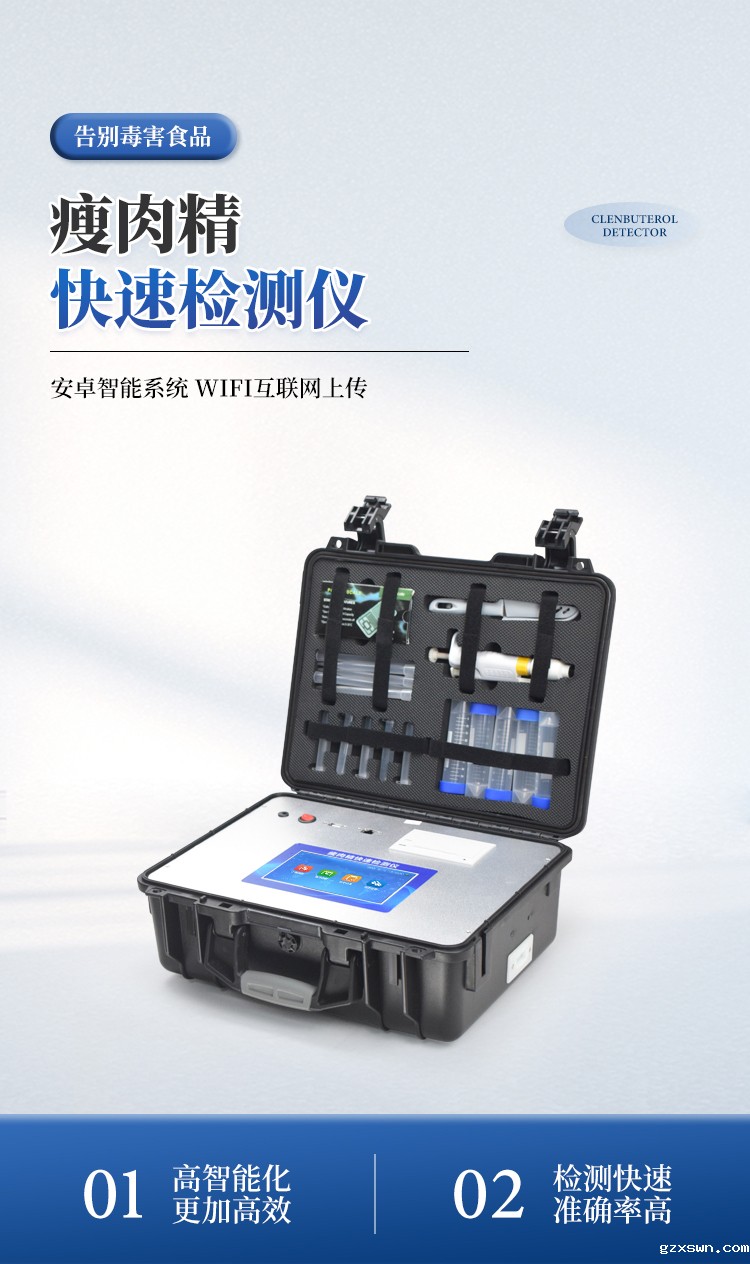 瘦肉精检测仪可现场快速检测盐酸克伦特罗、莱克多巴胺、沙丁胺醇、己烯雌酚、喹乙醇等。仪器预留其他项目检测程序和端口,根据日后需求可方便的自主增加检测项目。日后可升级为检测抗生素、兽药残留、动物疫病、病害肉、的综合类型仪器。